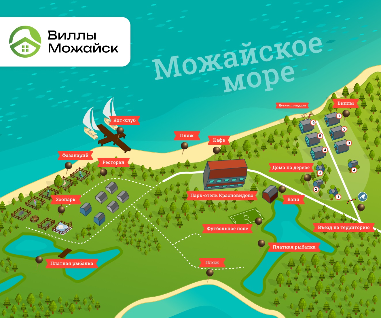 Мы находимся прямо на берегу «Можайского моря» на огороженной уютной территории с собственным пляжем, но при этом рядом с полноценной базой отдыха с рестораном, лодочной станцией, рыбалкой, зоопарком и массой других развлечений.
